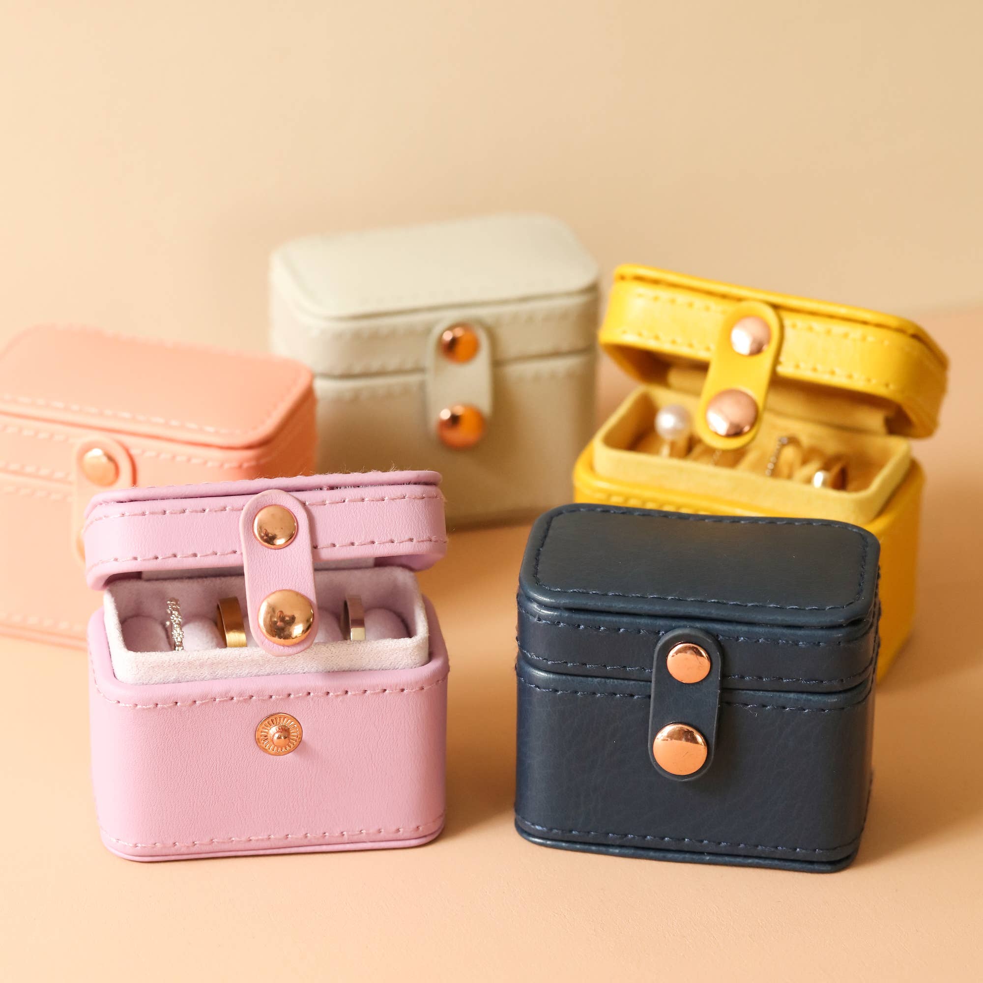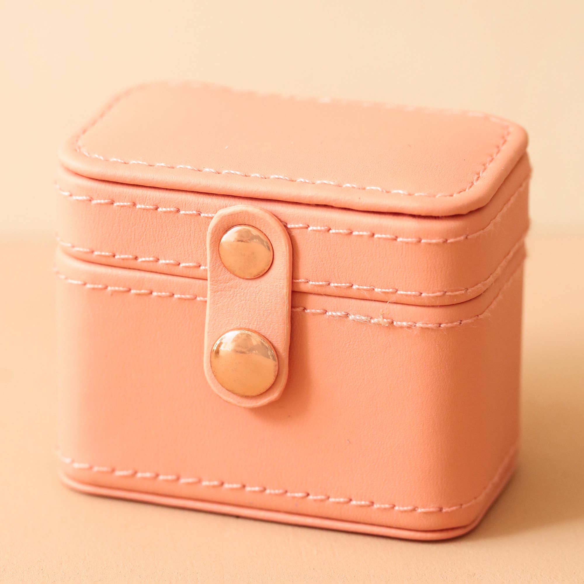Vegan leather travel ring box.Designed by the LA creative team.Peach pink design with popper fastening.Opens to reveal space for rings.PU outer and velveteen inner to protect pieces.From the Lisa Angel Accessories Collection.