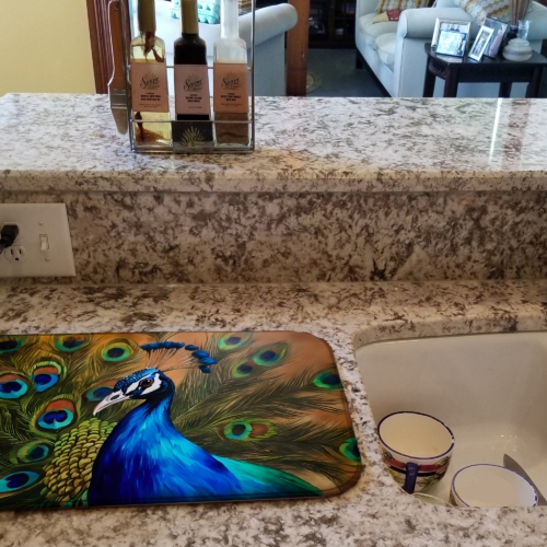 Dish Drying Mat featuring breed specific Peacock artwork. Say goodbye to messy countertops and soggy dish towels with our innovative dish drying mat. Our high-quality dish drying pad is designed to keep your countertops dry while offering a stylish and efficient solution. Whether you’re air drying dishes, glasses, stemware, silverware, pots, pans, bottles, or even fruits and vegetables, our dish mat is the perfect choice. The 14 inches x 22 inches size fits most counters and dish drying racks, and the non-slip design ensures stability. Made with water-absorbent polyester and a polyurethane foam insert, our dish drying mat is not only functional but also durable. It’s machine washable and printed in the USA for long-lasting use. The beautiful artwork adds flair to your kitchen decor, making it a perfect housewarming gift or present for any occasion. Upgrade your kitchen experience with our absorbent and versatile dish drying mat.