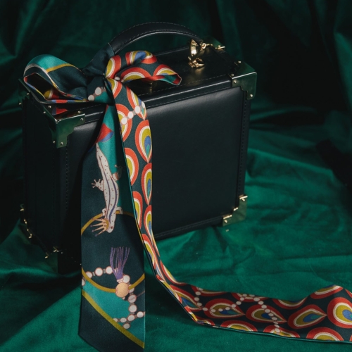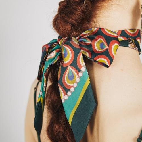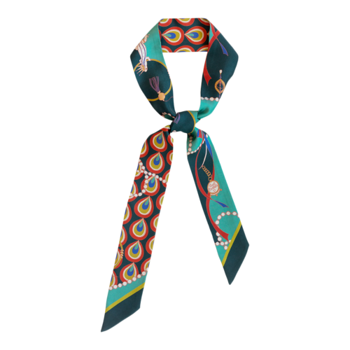 The feathers of a peacock exude luxury, class, and status. Each color as vibrant and rich as the next, sweeping pearl pattern quietly screams elegance. If you want the luxurious feel of a regal heiress as you strut to your next meeting, this is what you need. Product Description: 100% mulberry silk 120cm x 5cm ( 2″W x 47″L ) Double-sided stitching with different patterns on each side How to Wear Silk Twilly Neck Bow: As a necktie: worn as a bow around your neck, or tied like a classic necktie. As an accessory to a top: wear under a collared shirt. As a hair accessory: wear as a headband, or over a low ponytail, or woven into a braid. As a bag accessory: tie around your purse for a pop of color. As a body accessory: wear around your wrist like a bracelet. Style it any way you want in your own mood and creativity!