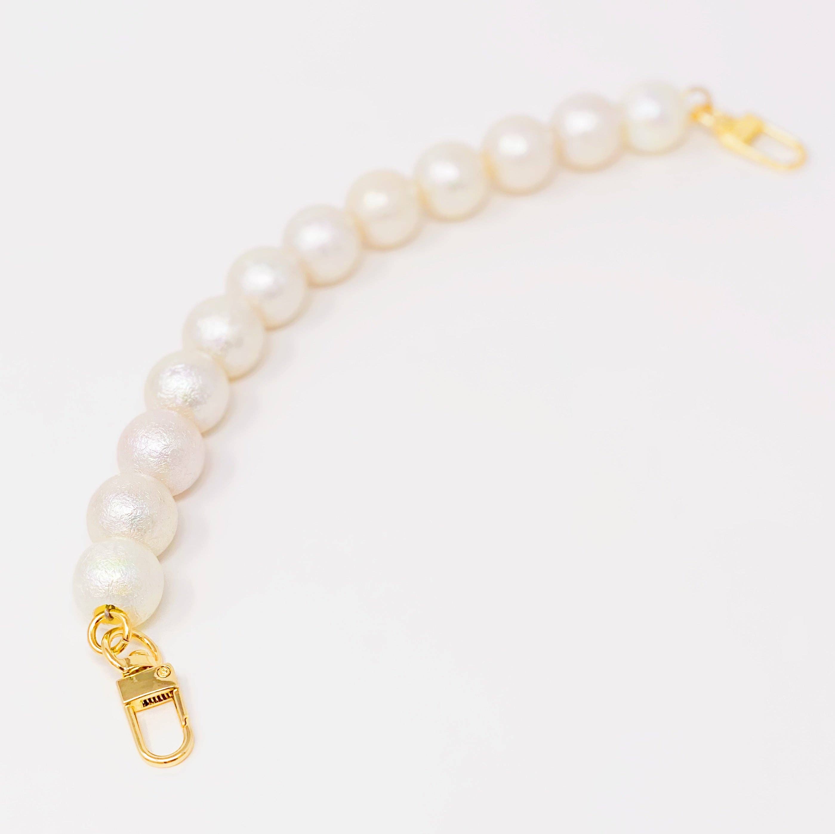 This beautiful pearl handle with gold tone clips are versatile to use for many different ways! Great accessory to add functions and styles! Great for cell phone handle, wristlet handle, key chain, and more! Cotton ball style pearl beads with textured aura color reflection finish Gold tone hardware Dimensions: approximately 12 inches in length Made in China