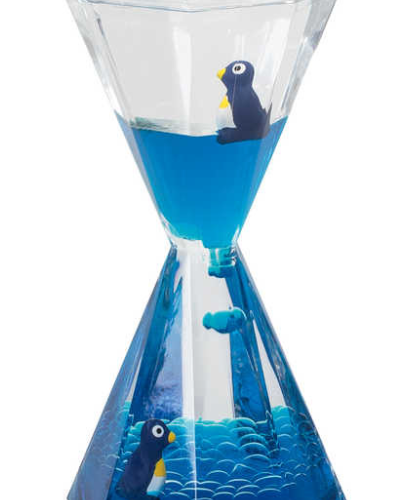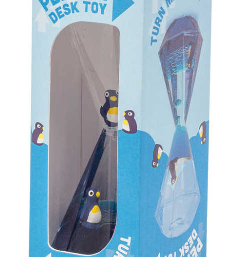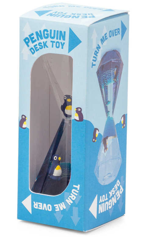 Liquid-filled hour glass containing a pair of bobbing penguins. Flip it over to make the blue liquid slowly cascade from the top section to the bottom, slowly causing one penguin to rise as the other sinks. Each end of the hourglass has a jewel-like shape, giving it an ornate appearance that’s different to most toys and novelties of this nature. The effect is almost hypnotic to watch, making it a fun desk toy that’s perfect for home or office use. Hourglass filled with liquid Contains two floating penguin figures Blue liquid drips between halves Jewel-like shape 13cm tall