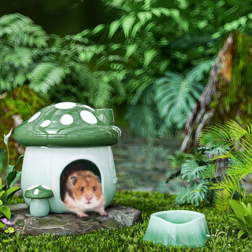Unique Mushroom shaped with Water Bottle Stand and Hamster Bowl Can be used as a set easy to match differnt cage.Made of degradable and environmentally friendly ceramic, which can effectively bite resistance. Water washable, can be use wet wipes for clean. (It will degrade into the soil after being placed outdoors for 1-2 years)The total size of Ceramic Hamster hut is 17*16.7cm/6.7″*6.6″(D*H) and entrance diameter is around 2.6inch(ca. 6.5cm) fits for dwarf hamsters, gerbils, mice, golden bears, chipmunk or other similar-sized pets.Lovely mushroom-shape Hamster Shelter House, effectively reduces pet’s body temperature during the scorching summer, and warm in the winter recommend for put cotton bedding into when use it.Designed a special buckle on the top cover which can be prevented hamsters knock over the cover. Remember to rotate the flower to the front of the ceramic house then take it off easily.