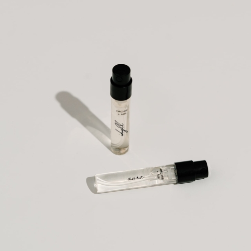 Includes both of our 100% non-toxic perfume scents, IDYLL and AURA. AURA Top: Grapefruit, Blood Orange Heart: Jasmine, Bellflowers, Neroli Base: Tonka Bean, Iris, Amber IDYLL Top: Bergamot, Plum Heart: Jasmine, Incense Base: Cedar, Vanilla, Musk
