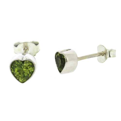 Little heart sterling silver stud earrings, set with peridot faceted stones. Complete with a post and butterfly back.