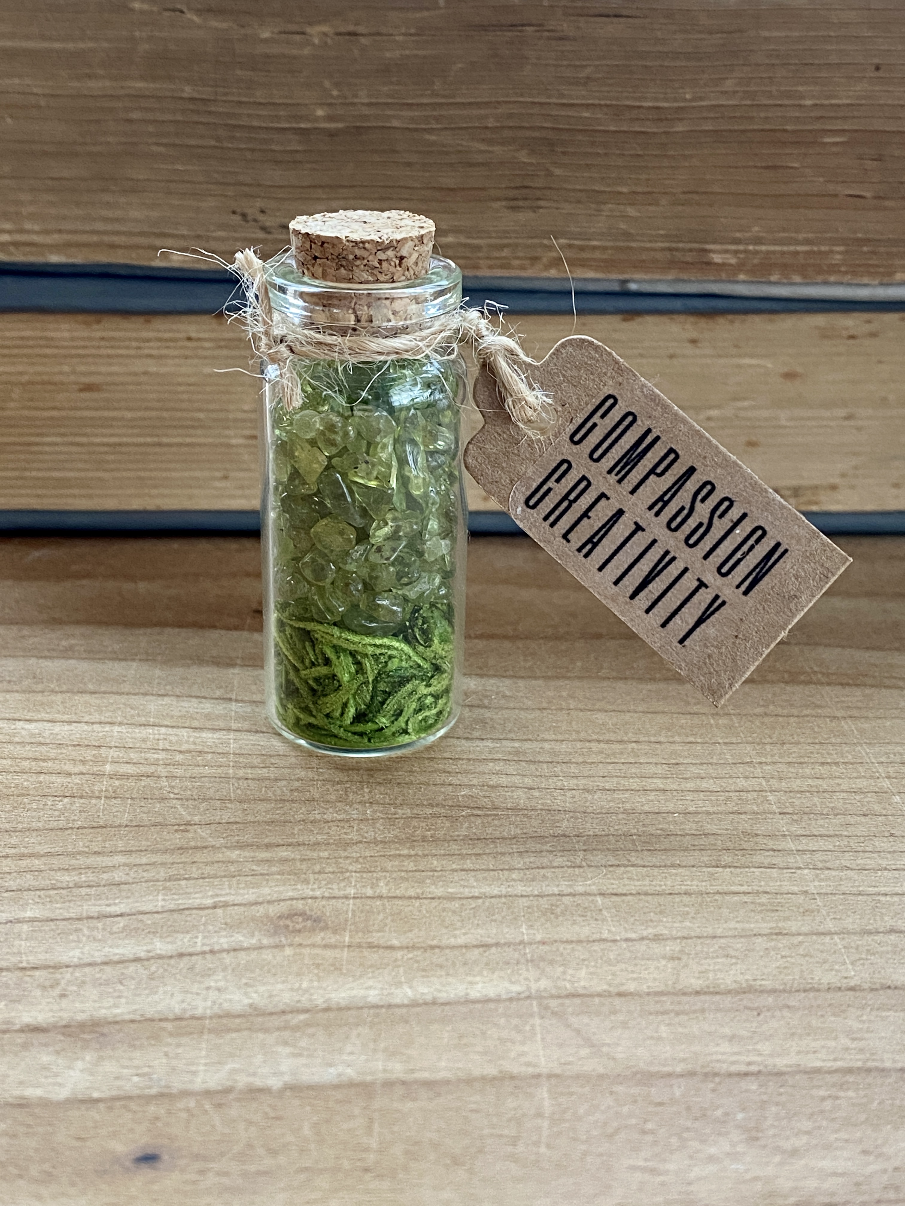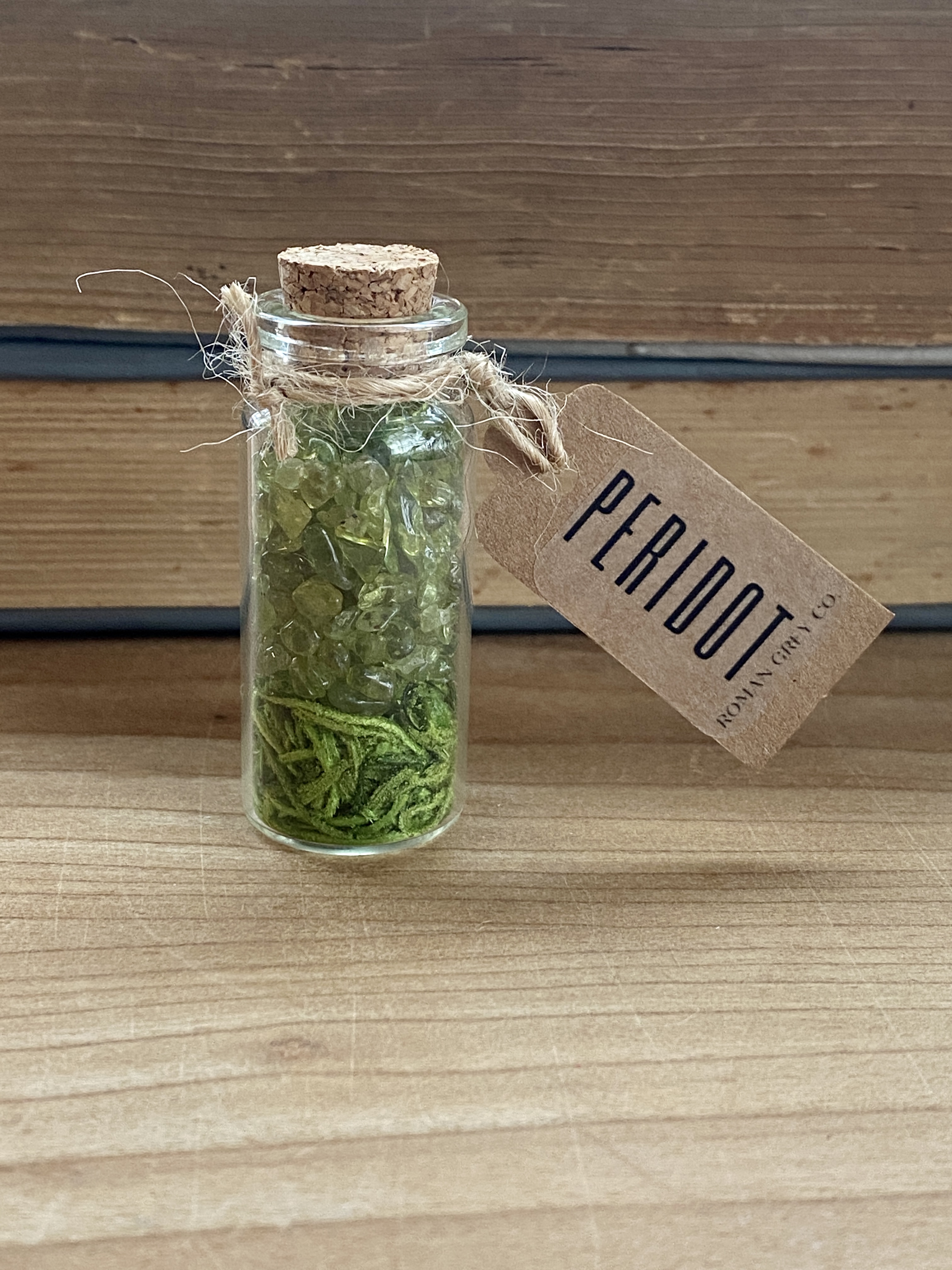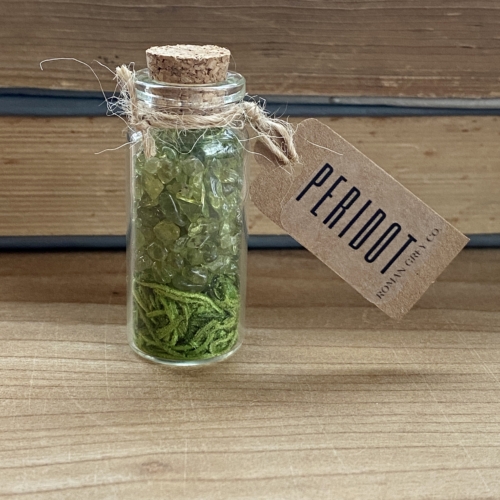 Peridot crystals rest on a bed of Spanish moss in a glass vile with a cork closure.