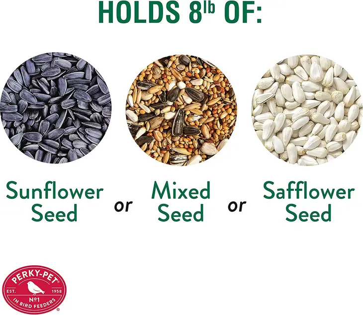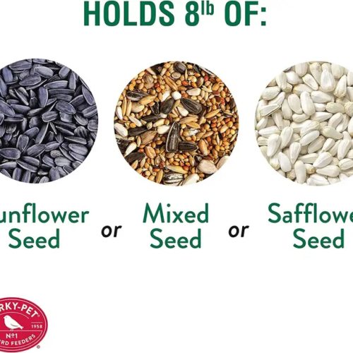 * Large Capacity – Holds up to 8 lb of black-oil sunflower seed, mixed seed, hulled sunflower seed, or safflower seed