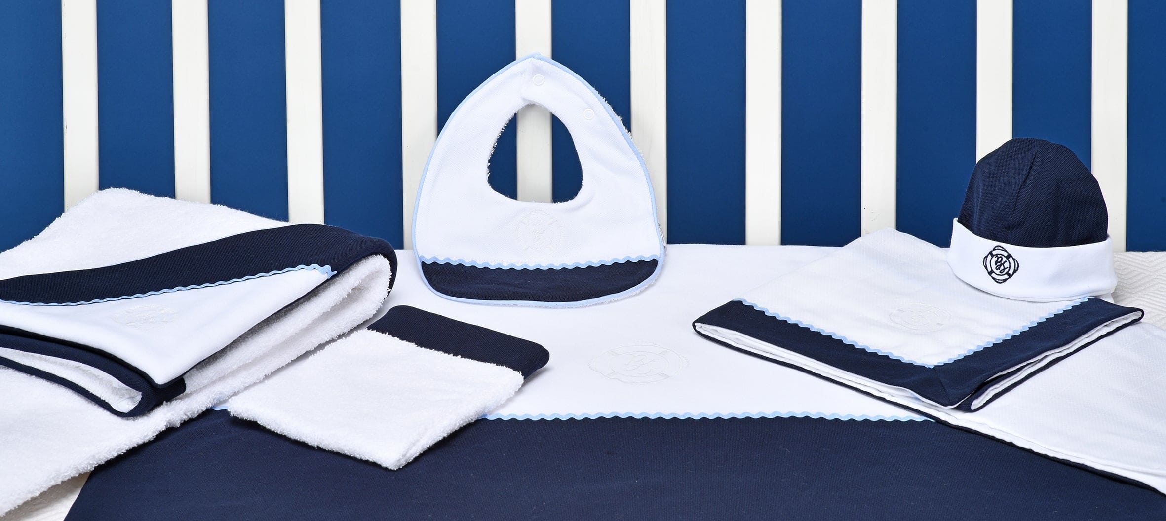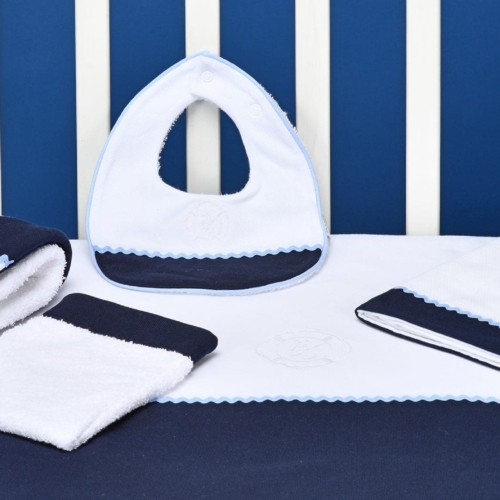 White and navy blue cotton pique jersey mittens made from soft cotton and adorned with a little embroidery on the front. 100% cotton (soft, stretchy cotton jersey) Machine wash (30°) Navy blue embroidery Matching items are available in the same collection Made in Portugal