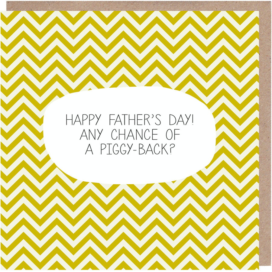Dads are good at two things: Grumbling and giving piggy-backs. Three things if you count moaning, but we reckon that’s covered by grumbling.Wish your dad a Happy Father’s Day and you never know – he might give you a piggy-back for old times’ sake.Printed on premium quality, FSC-certified 350gsm thick card, the design features the wording ‘Happy Father’s Day! Any Chance Of A Piggy-back?’.This quirky Father’s Day card comes with an attractive brown ribbed envelope. Card and envelope will be sent in a sturdy card-backed envelope. We’ve taken the #nakedcards pledge to cut out plastic card wrappers. You can find out more by searching the hashtag on social media. Card is blank inside for your own message.An original design by Paper Plane.Colours may vary from those on screen due to different monitor set-ups.Square card printed on FSC-certified 350gsm card.Card: H148 x W148mm. Envelope: H155 x W155mm