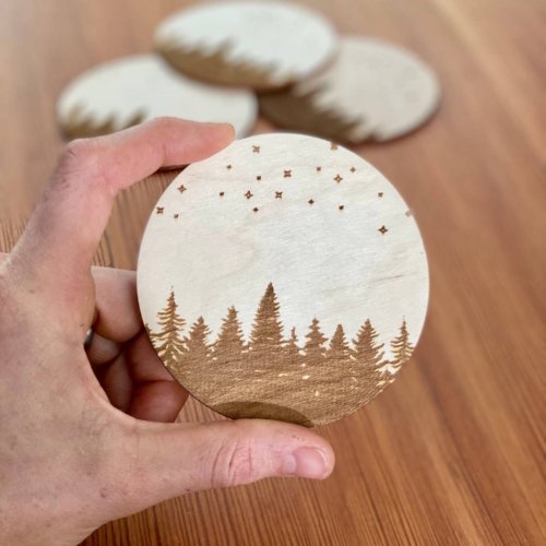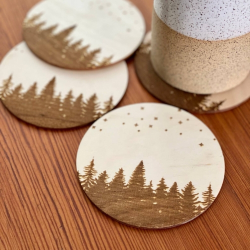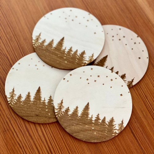 These coasters are 4” in diameter and 1/8” thick. They’re made from Baltic birch plywood circles that are laser engraved with pine tree and star silhouettes on one side. They are unfinished and hold up to daily living quite well.Details:• 4″ diameter, 1/8″ thick• Made from Baltic Birch plywood• Laser engraved with a high level of precision