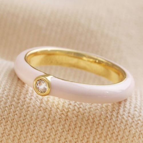 14ct gold plated brass borders the prettiest pale pink enamel, which highlights a radiant crystal in the centre of the ring. A stunning statement for finishing off your look with a pop of colour or the perfect addition to a stacking set for those that love to shine bright. DimensionsS/M – UK ring size L 1/2M/L – UK ring size OMade fromenamel, 14ct gold plated brass, cubic zirconia crystal