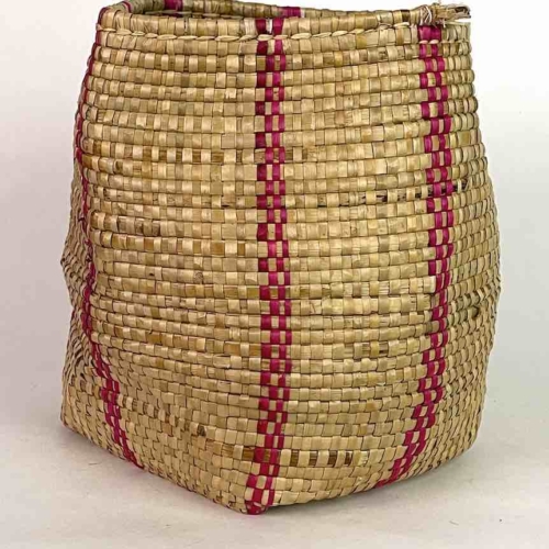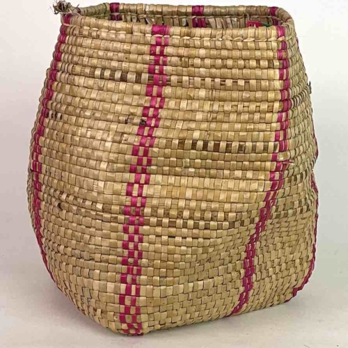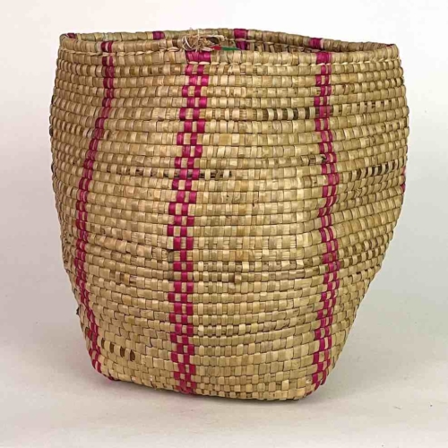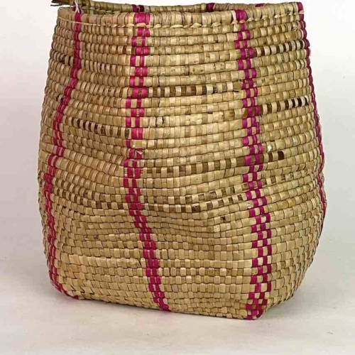 Handwoven from local swampgrass in the lowlands of coastal Togo, West Africa this baskets is the natural color of the straw, decoratively accented with dark green vertical stripes. This basket is not a replica: it is a one of a kind product, originally made for local tribal use. The Mina people in this area of Africa use this basket to carry just about anything they need to carry, to store items and to keep items available in markets for sale. This basket is 11.75″ tall (30 cm) x 10″ top opening diam. (25 cm)
