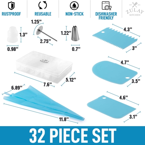 Turn your homemade recipes’ simple look into professional bakery-style aesthetics with the help of the Zulay Kitchen Cake Decorating Set. A fantastic 32-piece starter set for all kinds of confectionery decoration. Includes: 3 scrapers, 2 couplers, 1 flower nail, 2 silicone pastry bags & 24 icing nozzles.