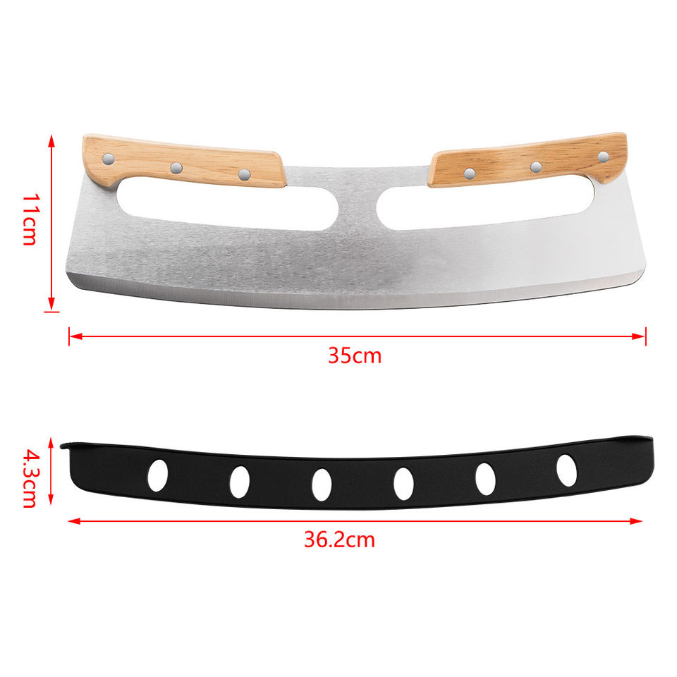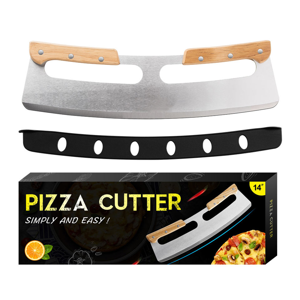Made of food grade 430 stainless steel blade and PP cover, the Pizza Rocker Knife is incredibly sharp, the whole steel plate is integrated to make no welding, no falling off, not easy to deform and rust.The pizza knife adopt the ergonomic double wood handle helps you cut pizza quickly and comfortably without causing any discomfort to your wrist, the unique double handles make it comfortable in hand and save strength. Different from a wheel roller cutter or ordinary pie slicer, the pizza knife slices easily through your pizza without pushing aside your pizza toppingsCurved sharp blade and arc design make stress concentration of force, allows you to cut the pizzas easily in one move smoothly. Easy to cut the pizza into the exact pieces without messing up the tops.Features with plastic protective sheath for safer handling and easy storage. No need to disassemble the pizza cutters, just rinse this pizza knife under running water or place in the dishwasher for hands free cleaning. Easy to clean and dishwasher safe.Measures approximately 14 inches (13.78×4.3x 0.7′) – ideal for cutting any small, medium, and large pizza with ease. And also the nice pizza accessories for cheese, cake, bread, pastry, sandwich, pies, herbs, fruits & vegetables.