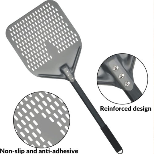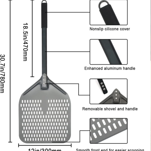 You Need That:Pizza peel designed for who loves pizza.With 12in large pizza peel turning pizza for pizza oven and outdoor oven.Premiun Quality:Perforated Pizza peel was made of alumina material which lightweight,easy to operate and not easy to bent.Great for home or restaurant pizza oven.Pizza Prepare:12in large pizza peel allow you to prepare your favorite pizza size .Alumina material with high temperature resistance and longer service life.It’s a best choice for you to make a pizza.Easy to Store&Clean:Pizza peel is detachable,easy to store at your kitchen and not take up large space at your kitchen.Alumina not easy to stick pizza ingredent when you turning pizza,easy to clean,Dishwasher safety also.Package and Service:Package include: 1×12in pizza peel.If you have any other issue for the item,feel free to contact us for help.