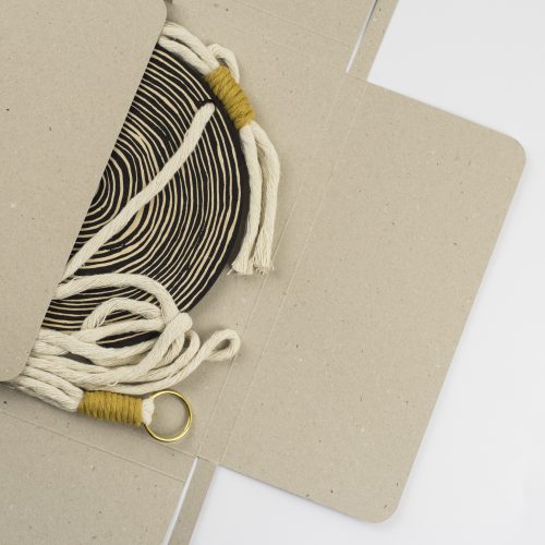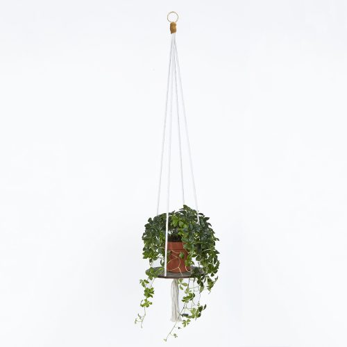Our version of macrame. The 20cm disk offers a platform for various sized of plant pots. Wood end-grain pattern screenprinted in our Leeds studio. Chunky Natural white macrame twine with yellow twine knots. Brass plated hoop for hanging.