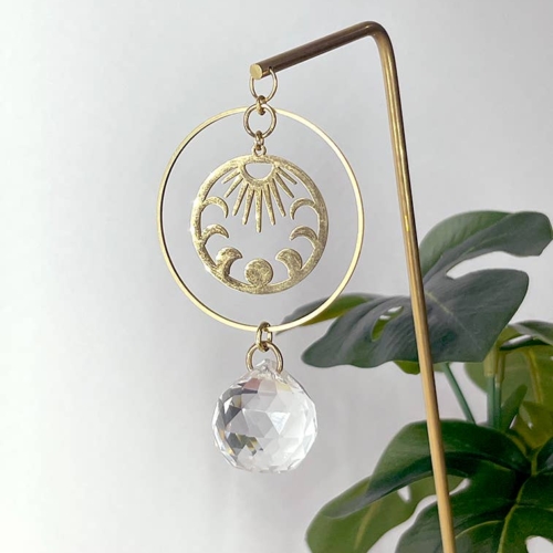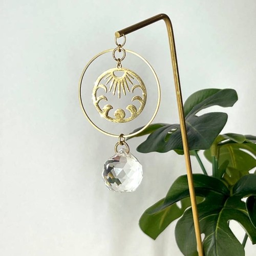 For all the plant ladies and plant lovers out there, the Plant Stick Sun Ray Moon Phase with Suncatcher Crystal is the perfect way to show your love for plants. When the sun rays hit the crystal, you’ll get a magical surprise! Made from raw (lacquered) brass rings and gold plated stainless steel charms, and features a single super-faceted glass ball to reflect light all over the place. (ps Cats love it)Height 10-5″Charm drop approx 3.5″