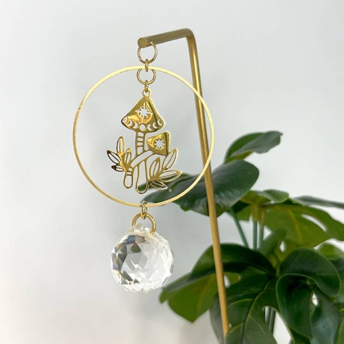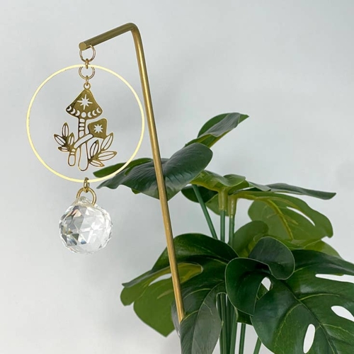 Bring a little bit of magic into your home with Plant Stick Shroomies with Suncatcher Crystal! These quirky little mushrooms with their glimmering suncatcher will be a welcome addition to any plant-lover’s life. Perfect for creating joy in your living space!Crafted with care in Sunny California!Made from raw (lacquered) brass rings and gold plated stainless steel charms, and features a single super-faceted glass ball to reflect light all over the place. Height 10-5″Charm drop approx 3.5″