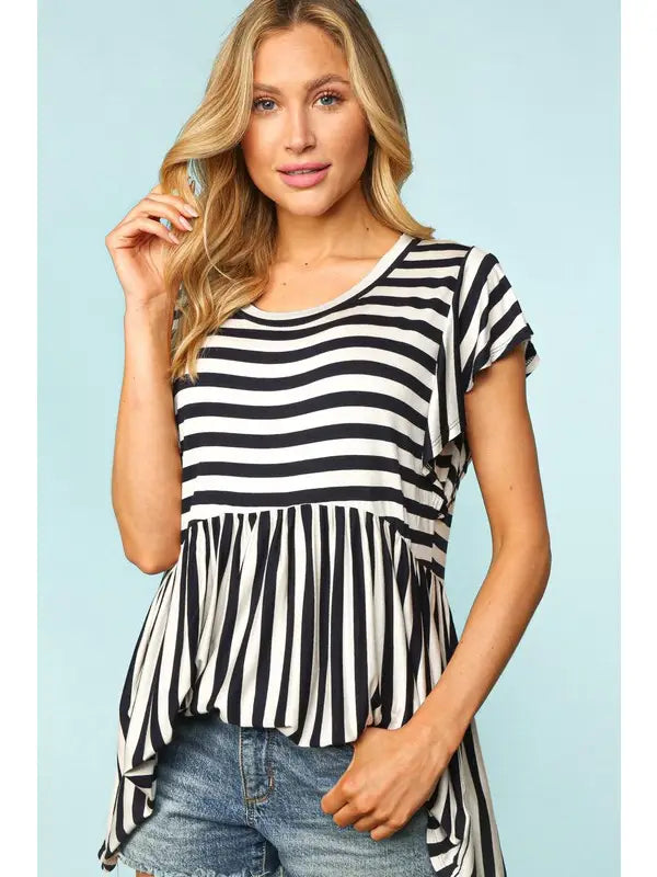Plus Stripe Short Sleeve Babydoll Peplum Knit Top – DARK NAVY/IVORY