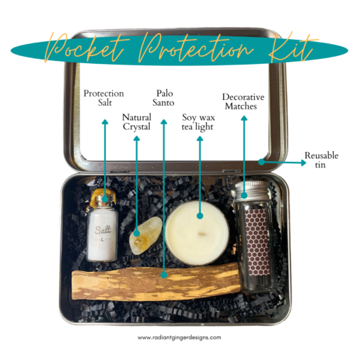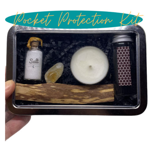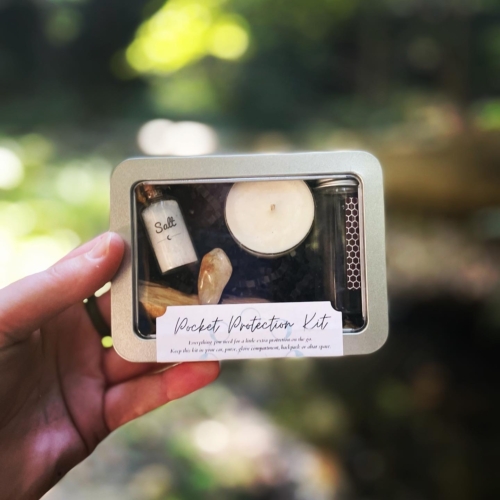 Each Protection Kit comes with a bottle of Protection Salt, a smudge stick (either Palo Santo or Sage), hand poured intention tea light, real natural crystal and decorative matches.