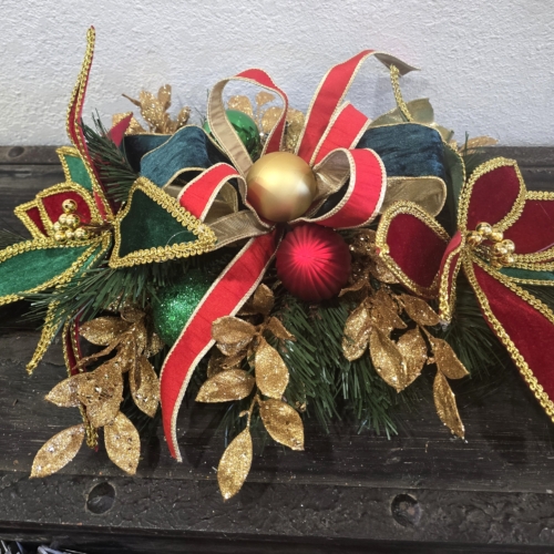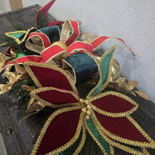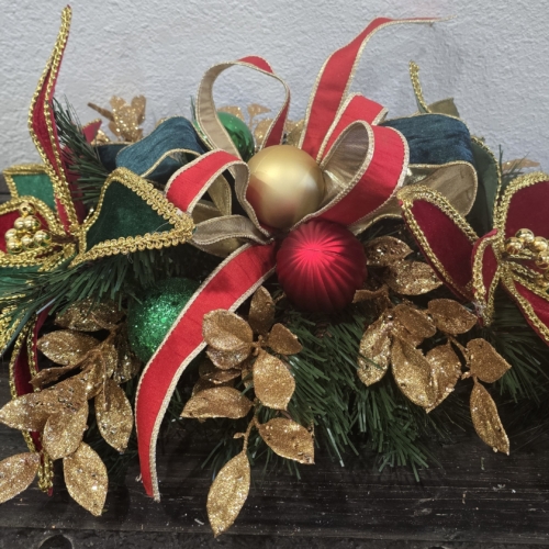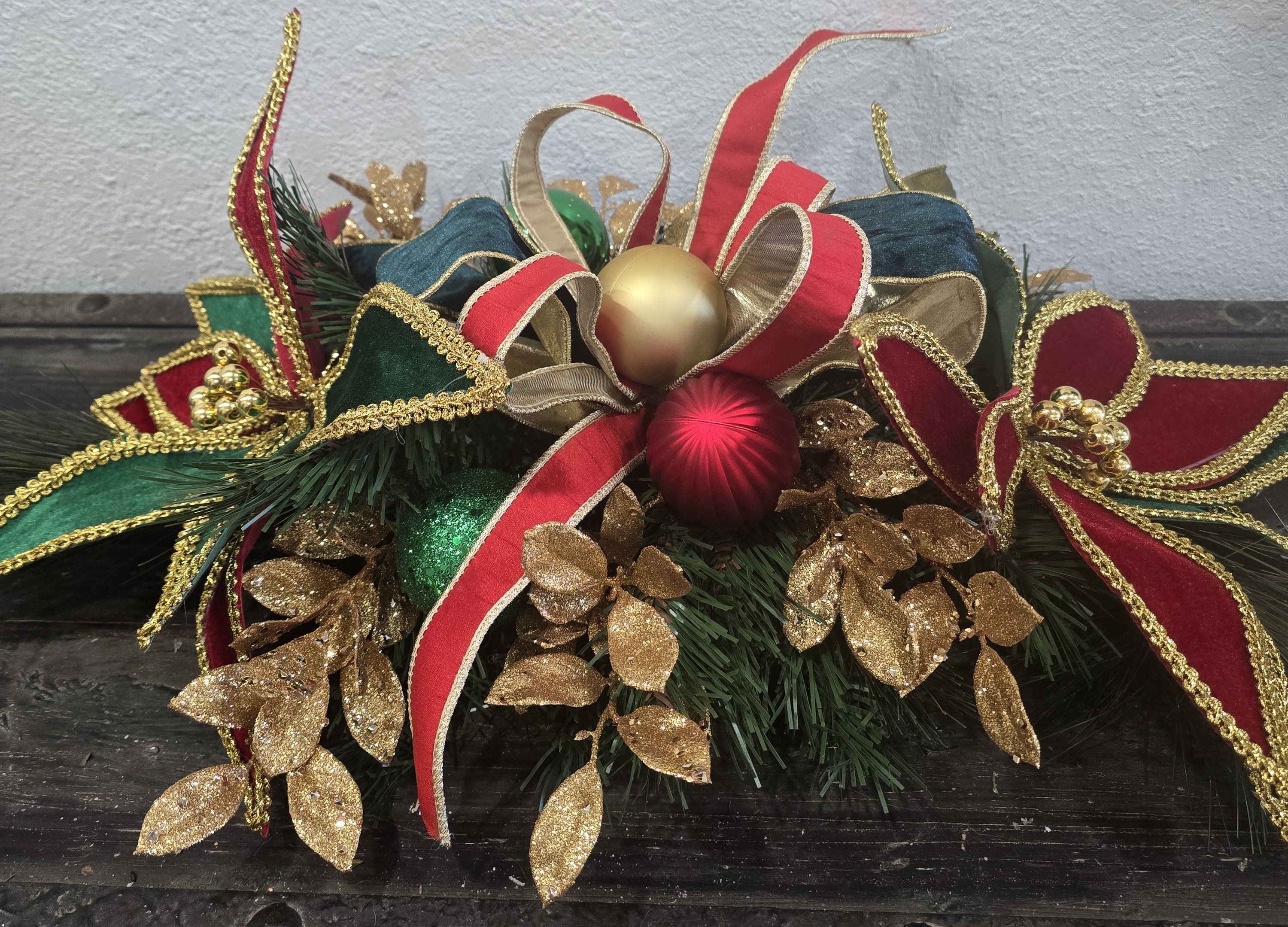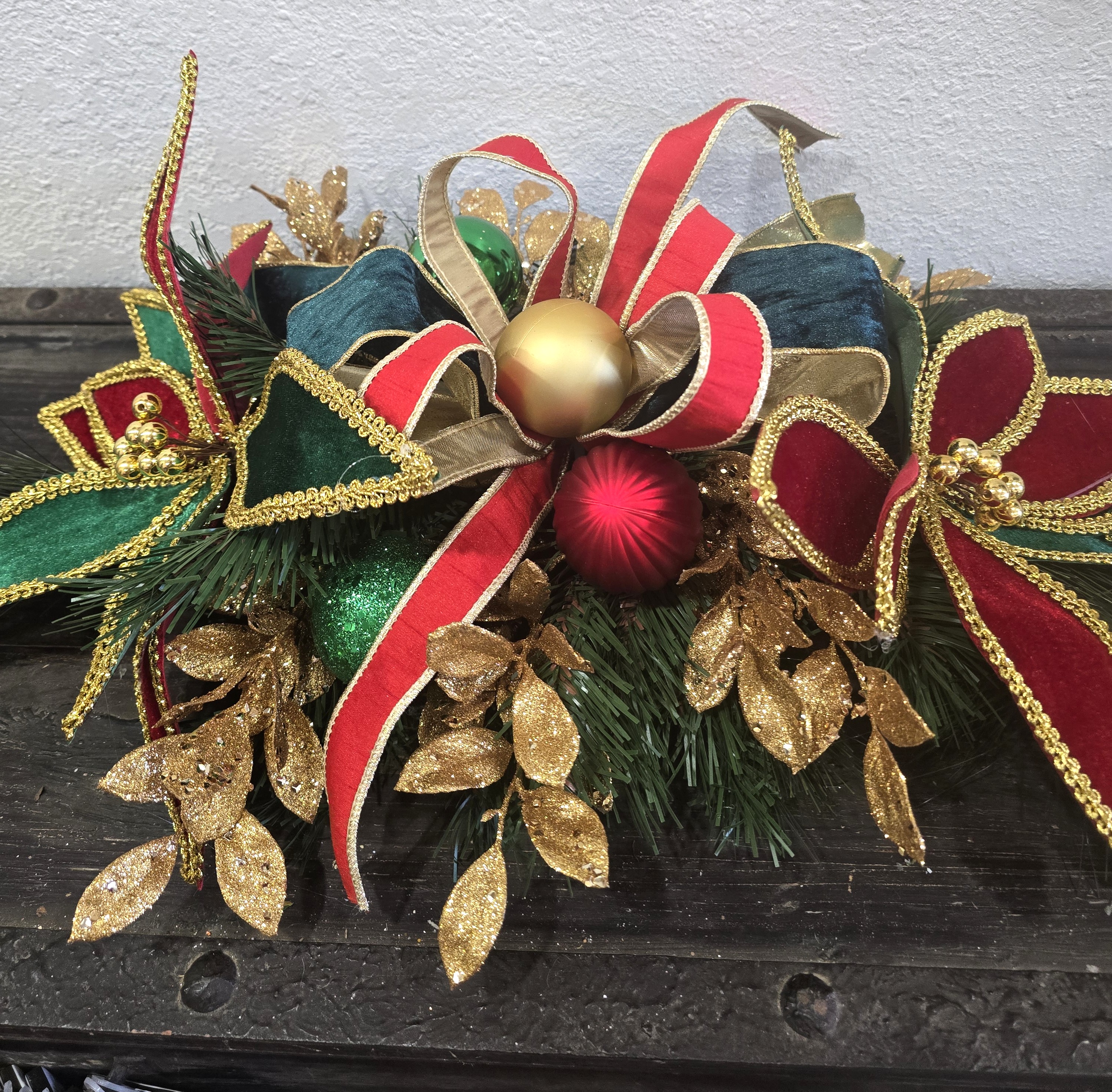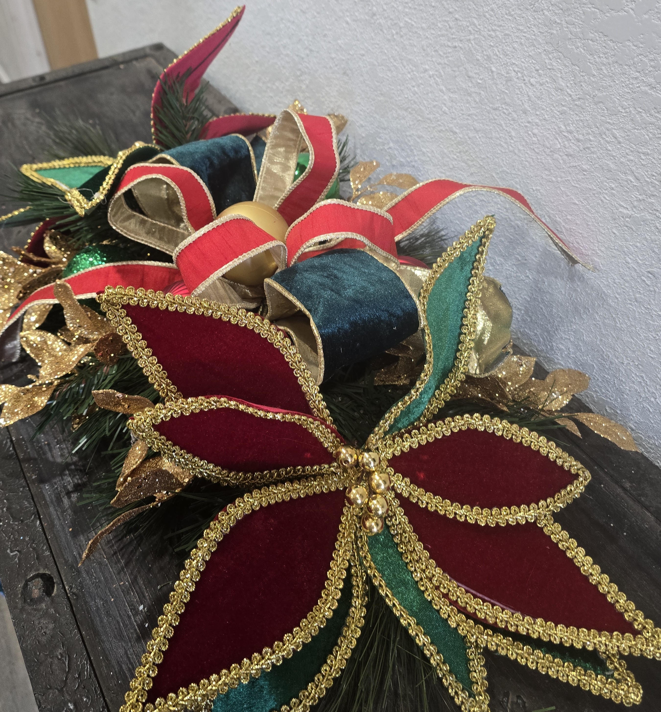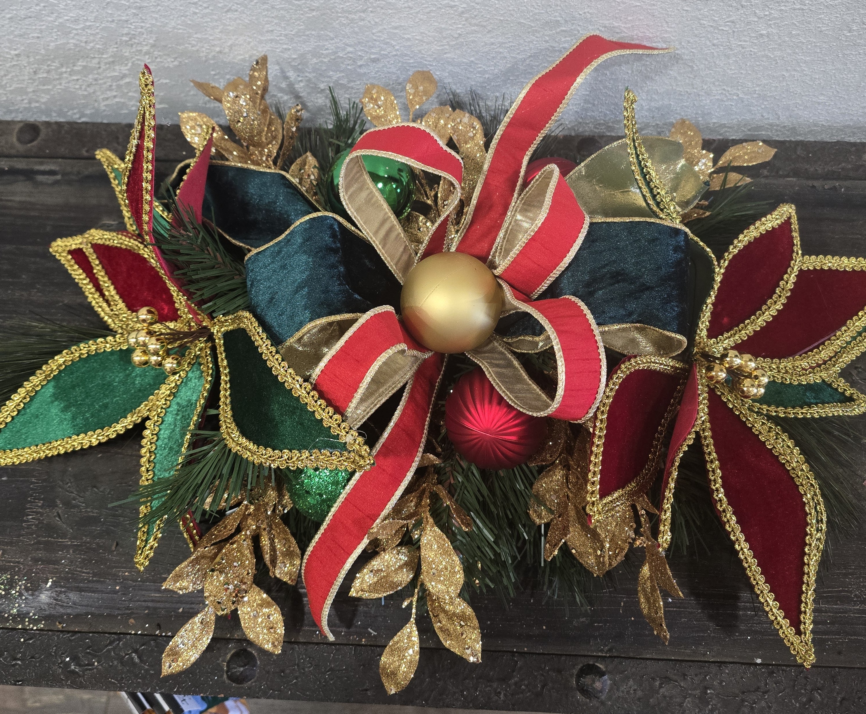 Elevate your holiday decor with our stunning Poinsettia Centerpiece. This vibrant arrangement features red, green, and gold accents for a festive touch to your home. It includes 2 large velvet poinsettias in green, gold, and red as well as sparkling gold leaves and Christmas ornaments. The ribbon is dark green and red and a bow is in the center. The arrangement measures approximately 24x14x7. Each one is individually handmade.