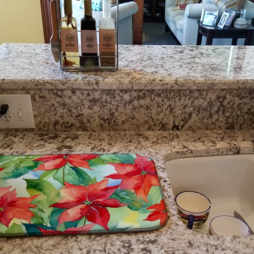 Dish Drying Mat featuring breed specific Poinsettias artwork. Say goodbye to messy countertops and soggy dish towels with our innovative dish drying mat. Our high-quality dish drying pad is designed to keep your countertops dry while offering a stylish and efficient solution. Whether you’re air drying dishes, glasses, stemware, silverware, pots, pans, bottles, or even fruits and vegetables, our dish mat is the perfect choice. The 14 inches x 22 inches size fits most counters and dish drying racks, and the non-slip design ensures stability. Made with water-absorbent polyester and a polyurethane foam insert, our dish drying mat is not only functional but also durable. It’s machine washable and printed in the USA for long-lasting use. The beautiful artwork adds flair to your kitchen decor, making it a perfect housewarming gift or present for any occasion. Upgrade your kitchen experience with our absorbent and versatile dish drying mat.