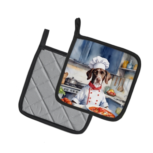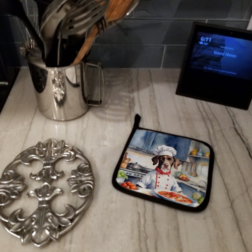 Pair of Pot Holders featuring breed specific Pointer artwork. A Pair of Pot Holders to match your kitchen decor. Made in the USA these are thick and functional. Full color artwork decorates the front polyester fabric of the hot pad and accented by a black trim. Use these at as a trivet for your Thanksgiving or Christmas tablescape. Filled with insulated fabric and quilted for durability. These colorful pot holders will make a great gift for your favorite home cook or executive chef. Each pot holder measures approximately 7 1/2 inches by 7 1/2 inches. A hanging tab is included.