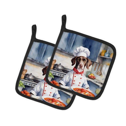 Pair of Pot Holders featuring breed specific Pointer artwork. A Pair of Pot Holders to match your kitchen decor. Made in the USA these are thick and functional. Full color artwork decorates the front polyester fabric of the hot pad and accented by a black trim. Use these at as a trivet for your Thanksgiving or Christmas tablescape. Filled with insulated fabric and quilted for durability. These colorful pot holders will make a great gift for your favorite home cook or executive chef. Each pot holder measures approximately 7 1/2 inches by 7 1/2 inches. A hanging tab is included.
