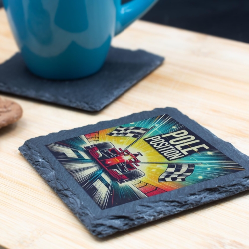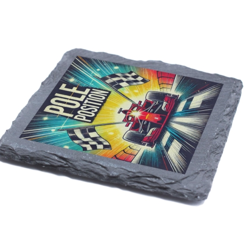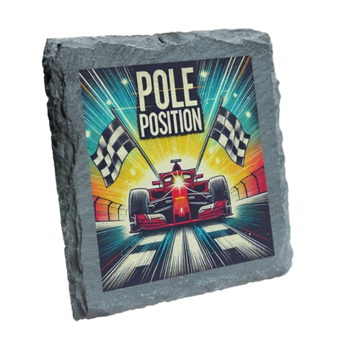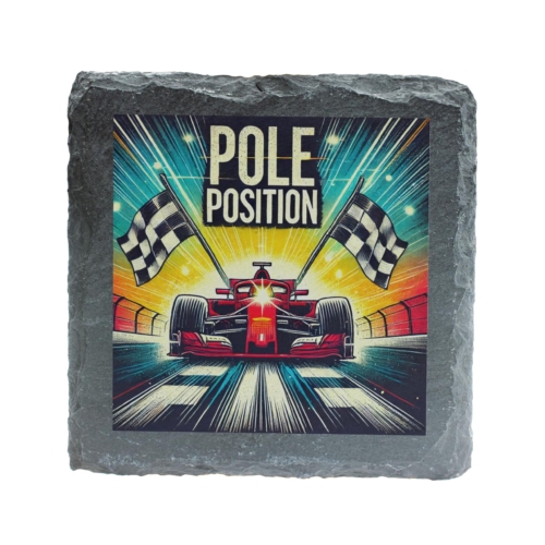 Bring the thrill of the race to your living space with the “Pole Position” Vibrant Racing Slate Coaster. Showcasing a bold and colorful illustration of a Formula racing car crossing the finish line, complemented by checkered flags, this coaster embodies the adrenaline and excitement of motorsport. Crafted from premium natural slate with rugged edges, it combines durability with artistic appeal. Ideal for protecting your furniture from moisture, heat, and scratches, this coaster is as functional as it is visually impressive. Whether as a unique piece for your coffee table or a thoughtful gift for a racing enthusiast, it?s sure to impress. Easy to clean and built to last, this coaster is perfect for those who love the speed, precision, and style of Formula racing! Bold Racing Artwork: Features a colorful and dynamic illustration of a Formula racing car in action, highlighted by “Pole Position” and checkered flags. High-Quality Slate Material: Made from durable natural slate with rugged edges, providing a modern yet rustic aesthetic. Protects Surfaces: Effectively shields tables and counters from moisture, heat, and scratches while adding a striking design element. Perfect for Motorsport Enthusiasts: A standout gift for Formula racing fans, car lovers, or anyone passionate about speed and style. Easy Maintenance: Designed for everyday use and simple cleaning with a damp cloth, retaining its vibrant design.