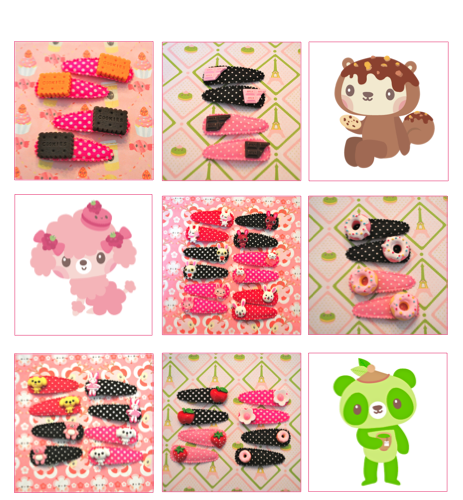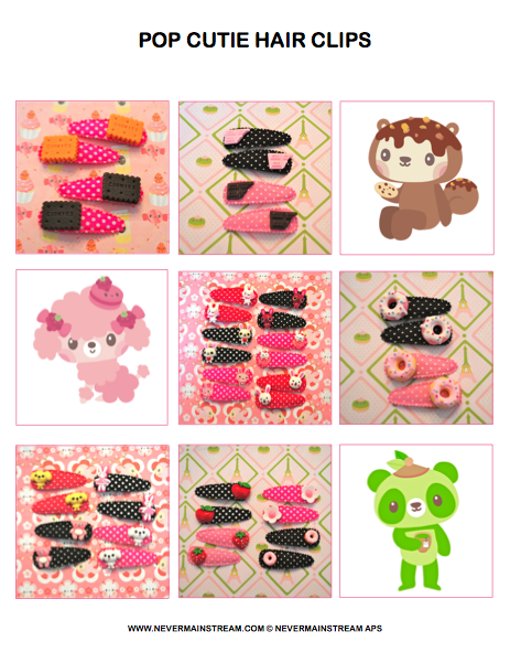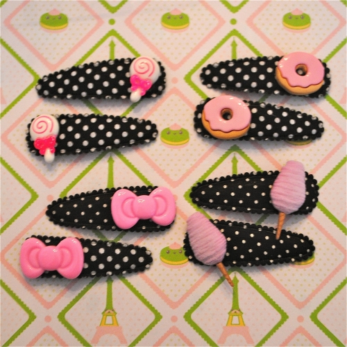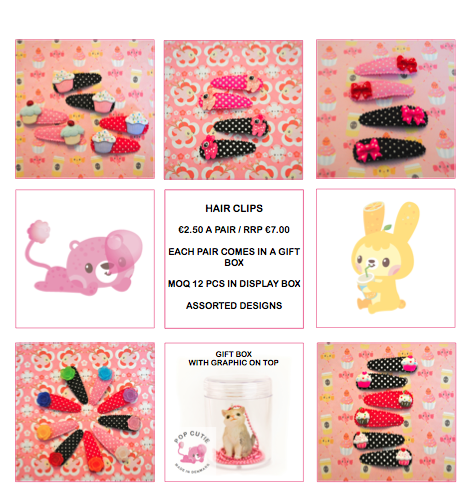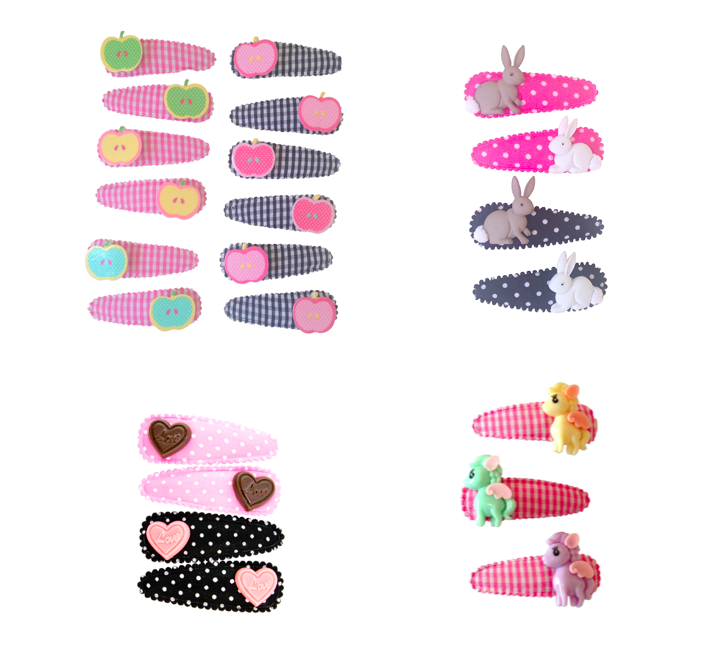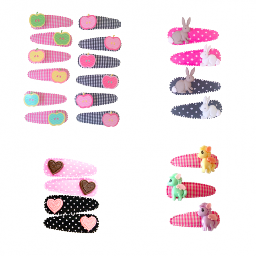 The Hair Clips comes in mixed designs of eg. Cup cakes, Ice cream, Kawaii Animals, Rosebuds and more