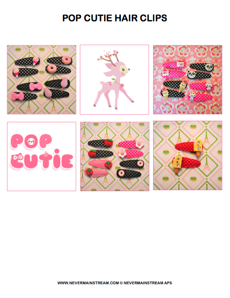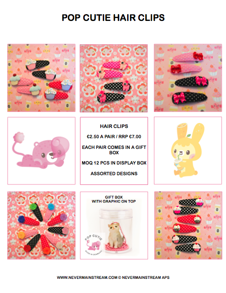 12 sets of Pop Cutie Hair Clips – each packed in a cute gift box with graphic made by the french illustrator Clementine Derodit.