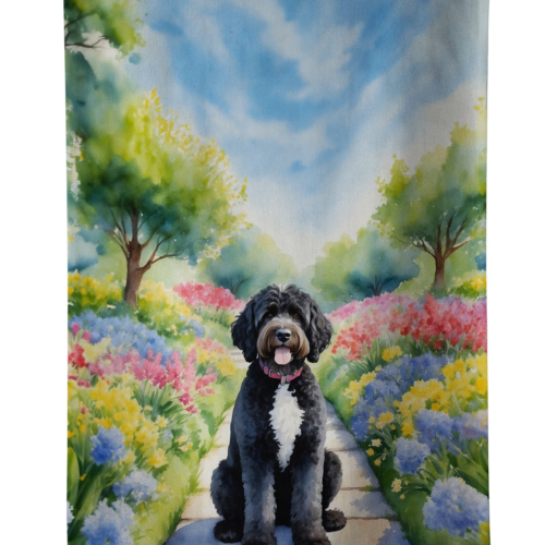 Kitchen Towel featuring breed specific Portuguese Water Dog artwork. Experience the perfect blend of aesthetic appeal and functional excellence with our Plush Velour Kitchen Towels. These are not your ordinary decorative kitchen towels that gather dust. Instead, they are designed to be as practical as they are stylish. The front layer of our towel is constructed from a minky plush polyester, known for its durability and color retention. Unlike conventional kitchen towels, the artwork on our towels is dyed directly into the fabric, ensuring vibrant colors that last. Polish your glassware to a brilliant sparkle using the plush front side of the towel. Flip to the back, crafted from 100% cotton terry loop, to exploit its exceptional absorbency for drying dishes or wiping down counters. Our kitchen towels redefine the concept of functional art, offering lasting quality that maintains the towel’s shape over time. Measuring 15 inches by 25 inches and weighing 2.3 lbs per dozen, these towels deliver an overwhelming sensory experience with their soft, plush, and smooth texture. The edges are meticulously finished with binding, enhancing their durability and visual appeal. For your convenience, these towels are machine washable and can be dried on low heat. After the first wash, the top fabric becomes even softer and fluffier, eliminating the need for ironing. Treat your kitchen to the luxury and functionality it deserves with our plush velour kitchen towels.