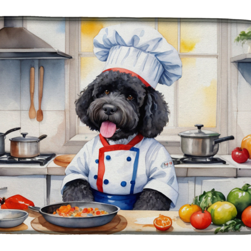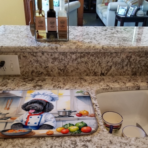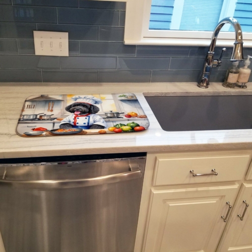 Dish Drying Mat featuring breed specific Portuguese Water Dog artwork. Say goodbye to messy countertops and soggy dish towels with our innovative dish drying mat. Our high-quality dish drying pad is designed to keep your countertops dry while offering a stylish and efficient solution. Whether you’re air drying dishes, glasses, stemware, silverware, pots, pans, bottles, or even fruits and vegetables, our dish mat is the perfect choice. The 14 inches x 22 inches size fits most counters and dish drying racks, and the non-slip design ensures stability. Made with water-absorbent polyester and a polyurethane foam insert, our dish drying mat is not only functional but also durable. It’s machine washable and printed in the USA for long-lasting use. The beautiful artwork adds flair to your kitchen decor, making it a perfect housewarming gift or present for any occasion. Upgrade your kitchen experience with our absorbent and versatile dish drying mat.