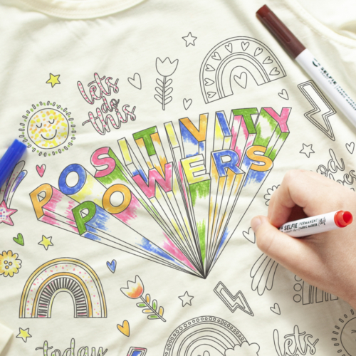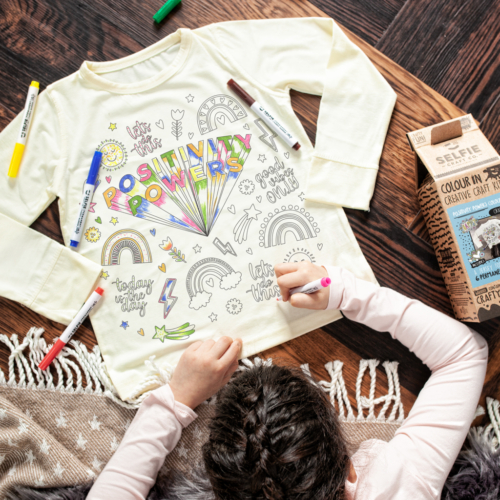 Set the mood with the Positivity Powers Colour-In Top! Use the included fabric pens to personalise uplifting designs, creating a unique, wearable masterpiece that spreads joy and inspiration.