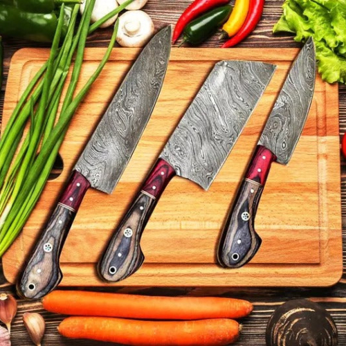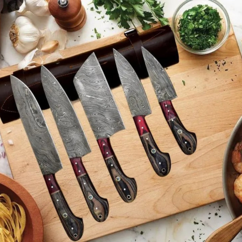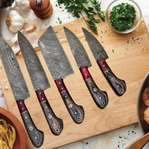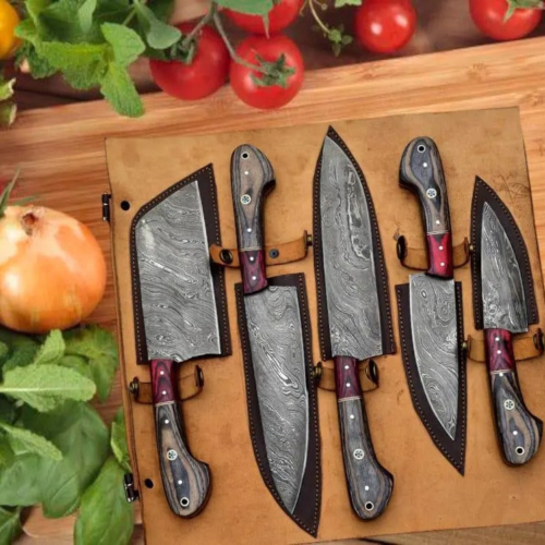๐ LAURAGELLERS Chef Knife Set ๐ ๐ช Blade Material: High-Carbon Damascus Steel๐ณ Handle Material: Premium Wood๐ Overall Length: 9″,10″,11″,12″,13″ Inches Each knife in our premium 5-piece set is meticulously hand-forged from high-carbon Damascus steel, offering razor-sharp edges, outstanding durability, and unique patterns that add elegance to your kitchen. The blades are expertly crafted to provide the perfect balance of strength and sharpness. This meticulous process results in blades that are not only stunning but also resistant to corrosion and wear, making them ideal companions for all your culinary adventures! ๐ Complementing these exceptional blades are handles made from premium wood, chosen for their unique grain patterns and ergonomic comfort. Each handle is skillfully shaped and polished to ensure a secure grip, allowing for precise control while slicing, dicing, and chopping. โจ Whether youโre a professional chef or a passionate home cook, our handmade Damascus steel chef knife set is designed to meet the demands of the most discerning culinary enthusiasts. With unparalleled performance, exquisite craftsmanship, and timeless elegance, this knife set is a perfect addition to any kitchen and a cherished heirloom for generations. ๐ ๐ Experience the artistry and precision of handmade craftsmanship with our Premium 5-Piece Damascus Steel Chef Knife Set and elevate your culinary creations to a whole new level! ๐ฝ๏ธ
