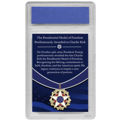 On October 14th, 2025, President Trump posthumously awarded the late Charlie Kirk the Presidential Medal of Freedom. Recognizing his lifelong commitment to faith, freedom, and the American spirit. His legacy continues to inspire a new generation of patriots. Grab yours now before they’re no longer available. A donation will be made to Turning Point USA for each card sold. Individually numbered, limited to only 2,025 available worldwide. 💎 Professionally Graded GEM-MT 10 🎖️ Vivid Full-Color Custom Artwork 🛡️ Sealed in a Collector’s Slab for Preservation 📦 Limited Production Run