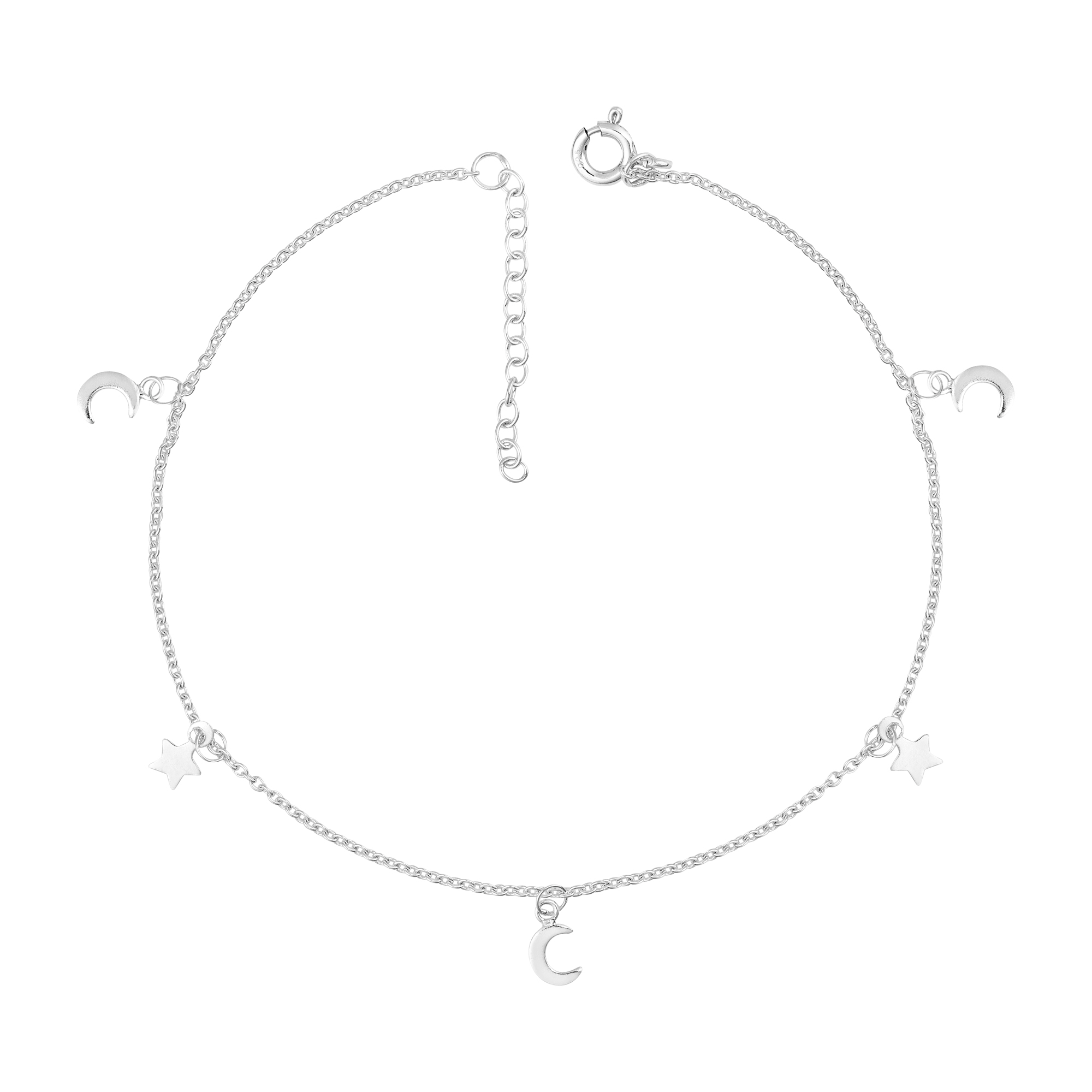 This is a Beautiful 925 Silver Moon & Stars Ankle Chain. It has a pretty 925 silver chain which is adjustable up to 10 inches. Hanging from the ankle chain are alternating silver Stars & moons.