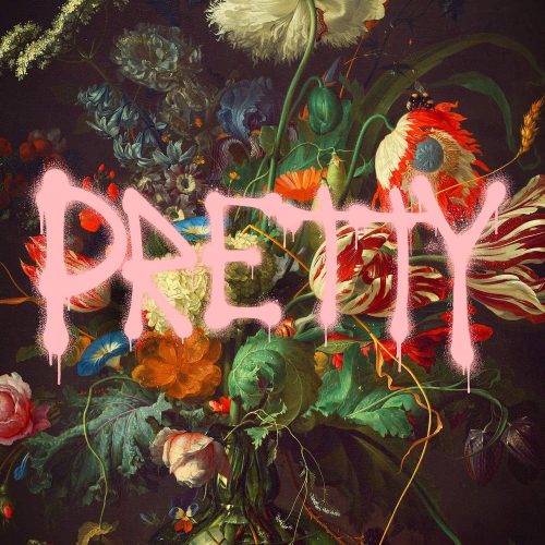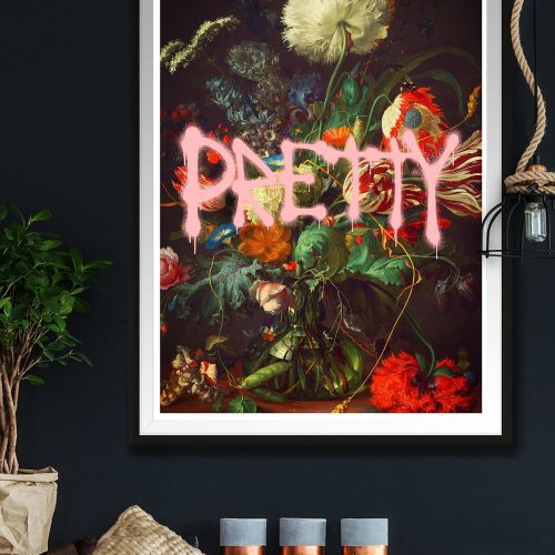 Beautiful vandalism! Vintage oil painting style image of a beautiful vase of flowers. Graffiti style writing over the top reading PRETTY makes this urban art print a real head turner. Adds an edge and quirky feeling to any interior, perfect for a dark decor maximalist style.