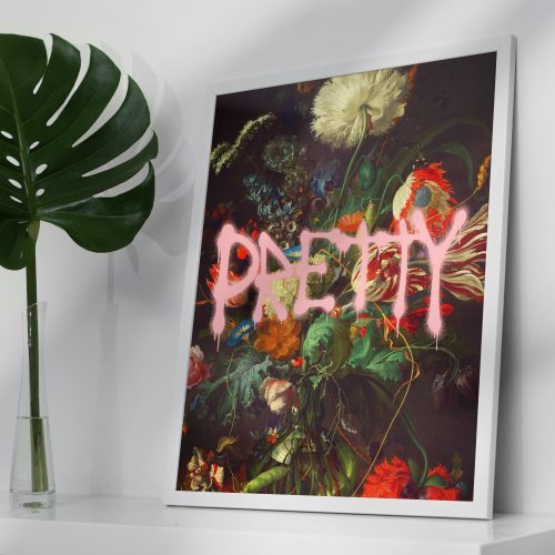 Beautiful vandalism! Vintage oil painting style image of a beautiful vase of flowers. Graffiti style writing over the top reading PRETTY makes this urban art print a real head turner. Adds an edge and quirky feeling to any interior, perfect for a dark decor maximalist style.