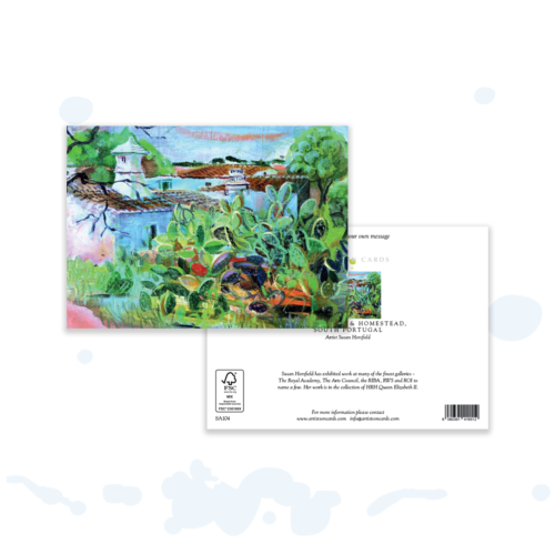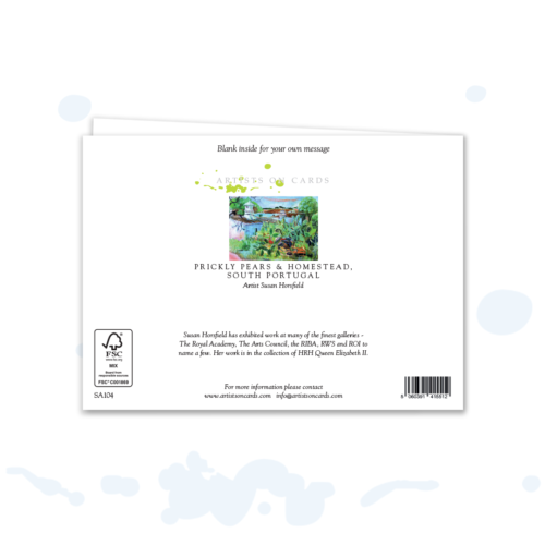 Evocative Algarve-inspired scene with whitewashed architecture and Opuntia cactus, from an original acrylic painting (mixed-media feel). Strong colour and botanical interest give broad appeal—great across art, travel and nature ranges.