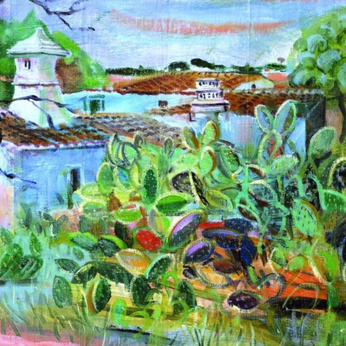 Evocative Algarve-inspired scene with whitewashed architecture and Opuntia cactus, from an original acrylic painting (mixed-media feel). Strong colour and botanical interest give broad appeal—great across art, travel and nature ranges.