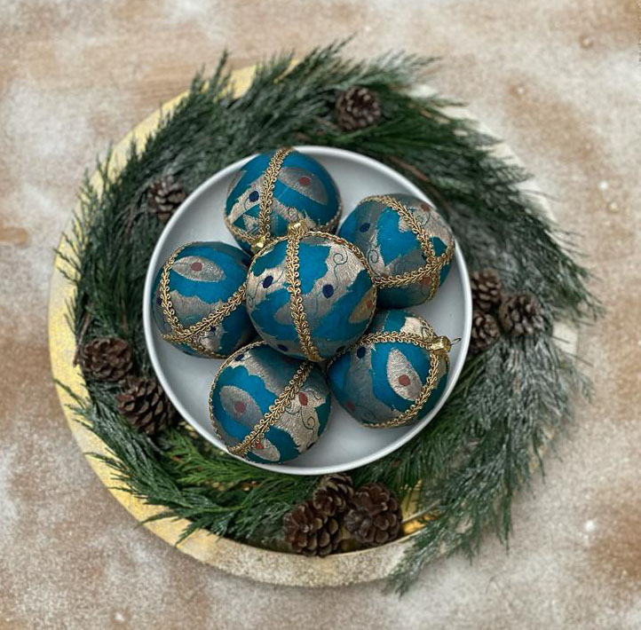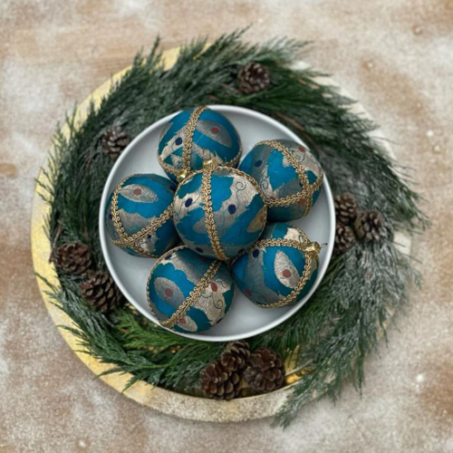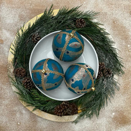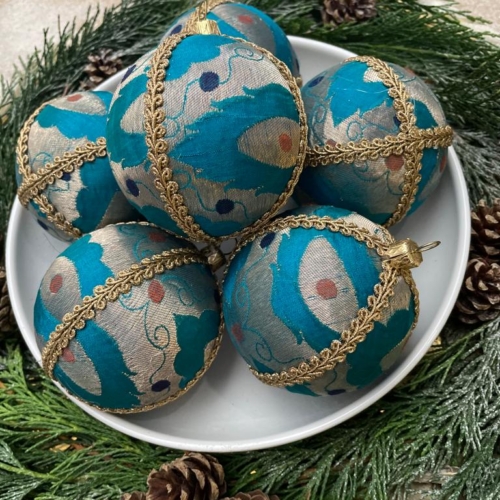 Beautiful handmade holiday bauble to decorate your home this festive season, made from upcycled fabric. Turquoise with silk thread banaris work.