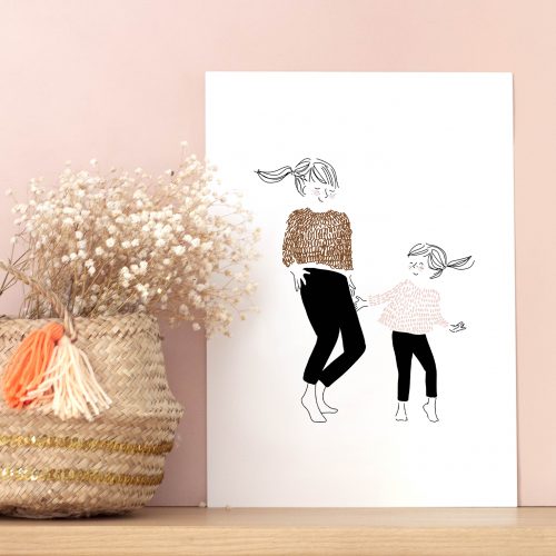 Print of a mum in a brown sweater and her daughter are dancing together.