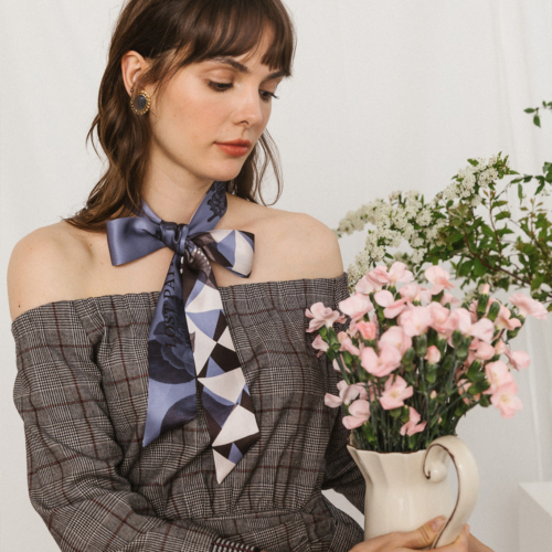 The skinny scarf is a unique twist of subtle style that compliments any look. The patterns are geometric prisms with a hint of femininity peeking through with the lace butterfly. This style marries the masculine necktie with the feminine scarf for a neutral tone. The Blue gives the cool, laid-back feel, while the Crimson is a power statement that wants to be noticed. Product Description: 100% mulberry silk 140cm x 5cm ( 2″W x 55″L ) Different prints on each side 2 color options: Blue and Crimson How to Wear a Silk Skinny Scarf: As a scarf: wear it around the neck. You can tie a bow or let the end hang loose. As an accessory to a top: wear under a collared shirt As a vest: loosely worn over the shoulders, framing a top or jacket As a hair accessory: woven into a braid or over a low ponytail As a bag accessory: Around your purse for a pop of color As a belt: for a high waisted look over a dress or with pants Style it any way you want in your own mood and creativity!