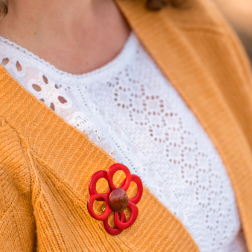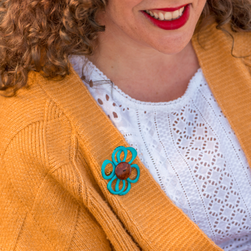 Delicate, this brooch is made with slices of tagua arranged into the form of a daisy.