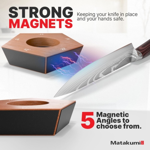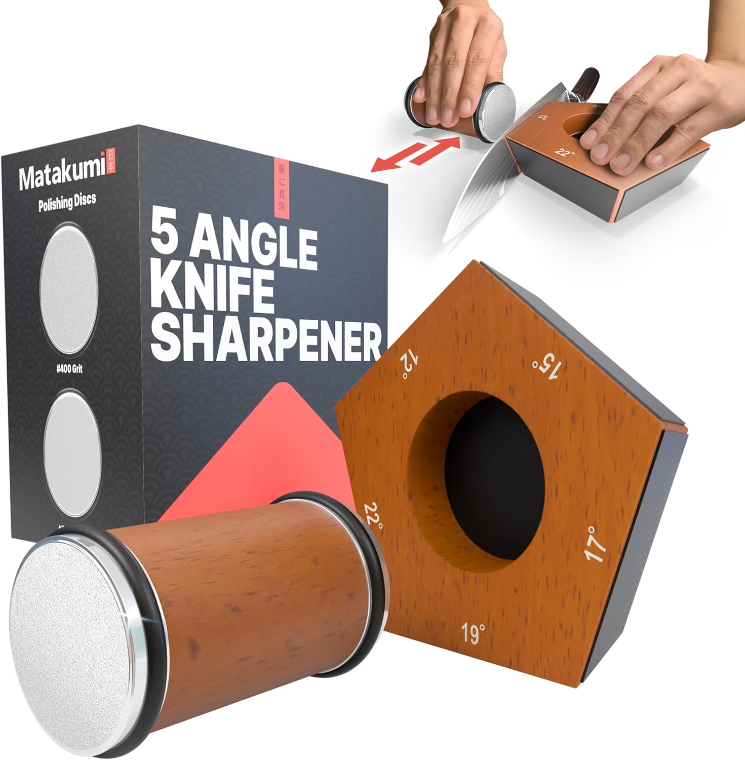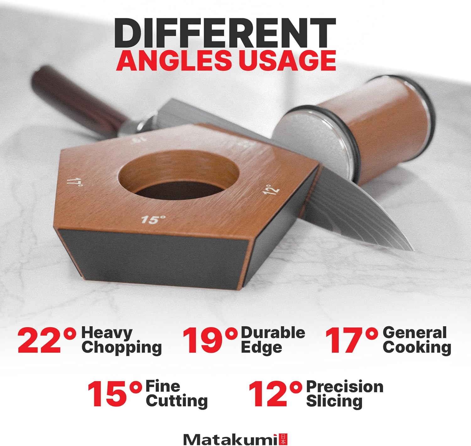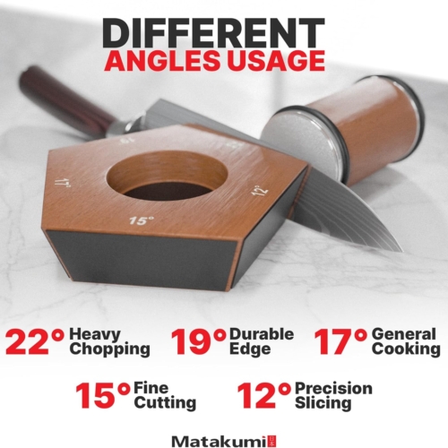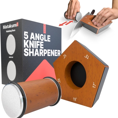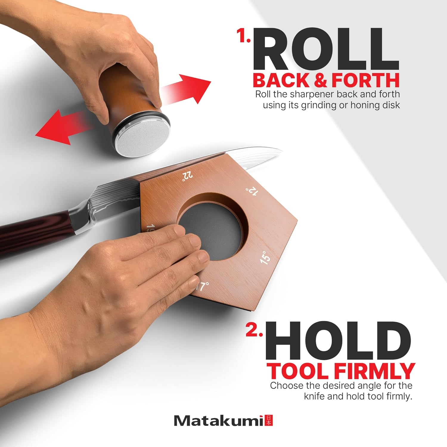 Multi-Angle Sharpening: Elevate your cutting game with our Rolling Knife Sharpener featuring five precise angles (12-15-17-19-22 degrees). Whether it’s delicate slicing or chopping, with our sharpener your knives are honed to perfection for any task.Effortless Versatility: Skip the complexity; our simple, rolling knife sharpener kit effortlessly restores blades to factory sharpness without the need for electricity. With our knife sharpener tool, maintaining sharp edges has never been easier.Efficient and Time-Saving: Say goodbye to lengthy sharpening processes; Matakumi gets your knives ready for action in minutes. With our rolling knife sharpener kit, you’ll breeze through sharpening tasks, saving valuable time in the kitchen.Space-Saving Solution: Matakumi’s compact design ensures it takes up minimal space in your kitchen, maximizing convenience. With our versatile roller knife sharpener, you’ll enjoy efficient sharpening without sacrificing precious counter space.Simple Sharpening: Simplifies sharpening thanks to its user-friendly design, allowing you to effortlessly restore your blades . Delivering the performance of a professional knife sharpener, it ensures precision and reliability with every use.