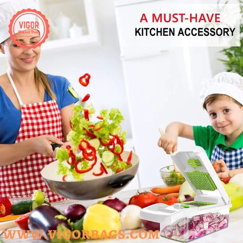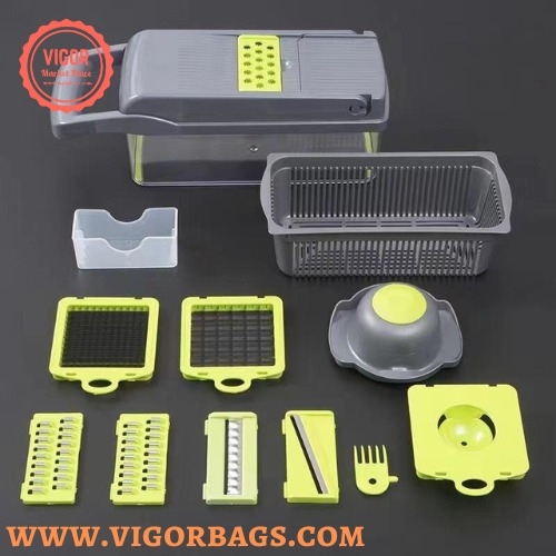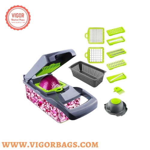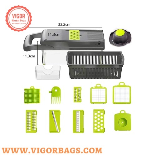 12 in 1 Professional Mandoline Slicer for Kitchen, Multifunctional Food Chopper Cutter for Potato, Tomato, Veggie with 8 blades and Filter BasketUltra-sharp food chopper can help you shorten Prep time comparing with traditional blades chopping/dicing/slicing. The hardened stainless steel vegetable chopper is easy to chop or slice veggies and fruits with 1 easy motion every time.The blades are sharp, depending on the hardness of the vegetables or fruits to use different force to cut. Let cooking become your pleasure!Chop, Dice, Slice or Grate with our Multi Veggie Chopper and Slicer by Ourokhome! Extra sharp and RUST RESISTANT blades, The blades of food chopper is made from heavy-duty 420 stainless steel to make them extra durable. The main body of the vegetable chopper is made from BPA-free food grade, heavy duty reinforced ABS. With our veggie chopper, you can not only save a lot of space in your kitchen, but also save a lot of valuable time for each meal!All blades can be easily replaced at will. Comfortable handle gives you more stability in the process of slicing, shredding and grinding. In addition, we have a hand guard to protect your hands. 1.2L collection tray catch all your chopped vegetables, which will make your countertop without messy. Two anti-slip strips on the storage box make you more stable when operating. The drain basket is a great help for your cleaning and drying ingredients.People attach more and more importance to healthy life. Eating healthy is even more important. It will take a lot of time and effort to dice, chop and slice the veggies of a desired dish. ****************************************************************************Package Includes:Each pack Contains 1 Item based on your check out count of selection******************************************************************************