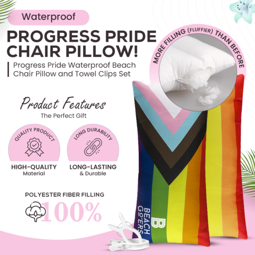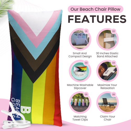 The Progress Pride Beach Chair Pillow helps you maximize your relaxation on a beach or at the pool! Our lightweight and fluffy beach pillows adjust under the head and neck to ensure you enjoy spending your day lounging at the beach or by the pool. We have created this unique product so you can say goodbye to all those sunny days spoiled by sore necks.