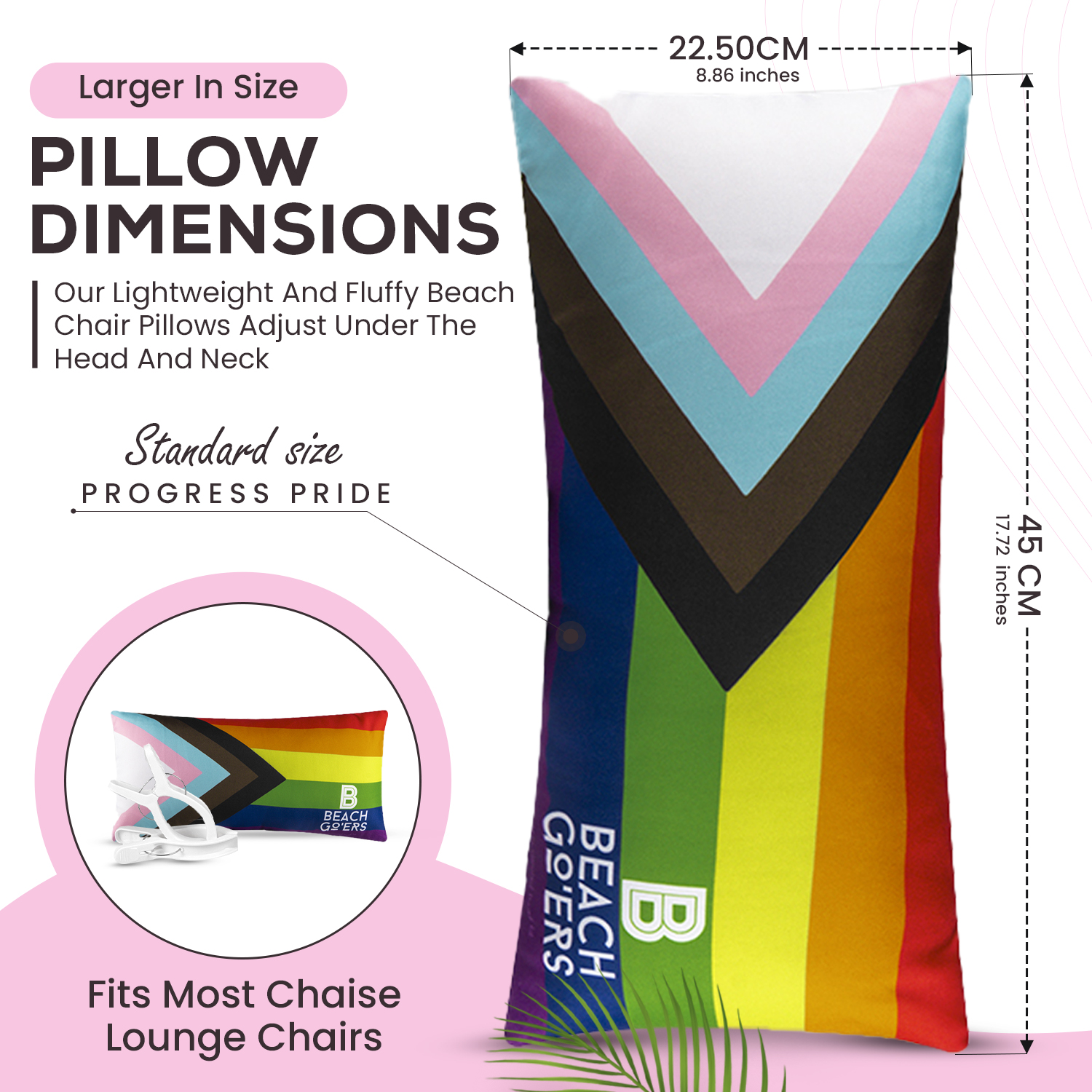 ✈ The Progress Pride Beach Chair Pillow is 17.72″ x 8.86″ (45 cm x 22.5 cm) with the strap being able to stretch to 30″ (76 cm) long!