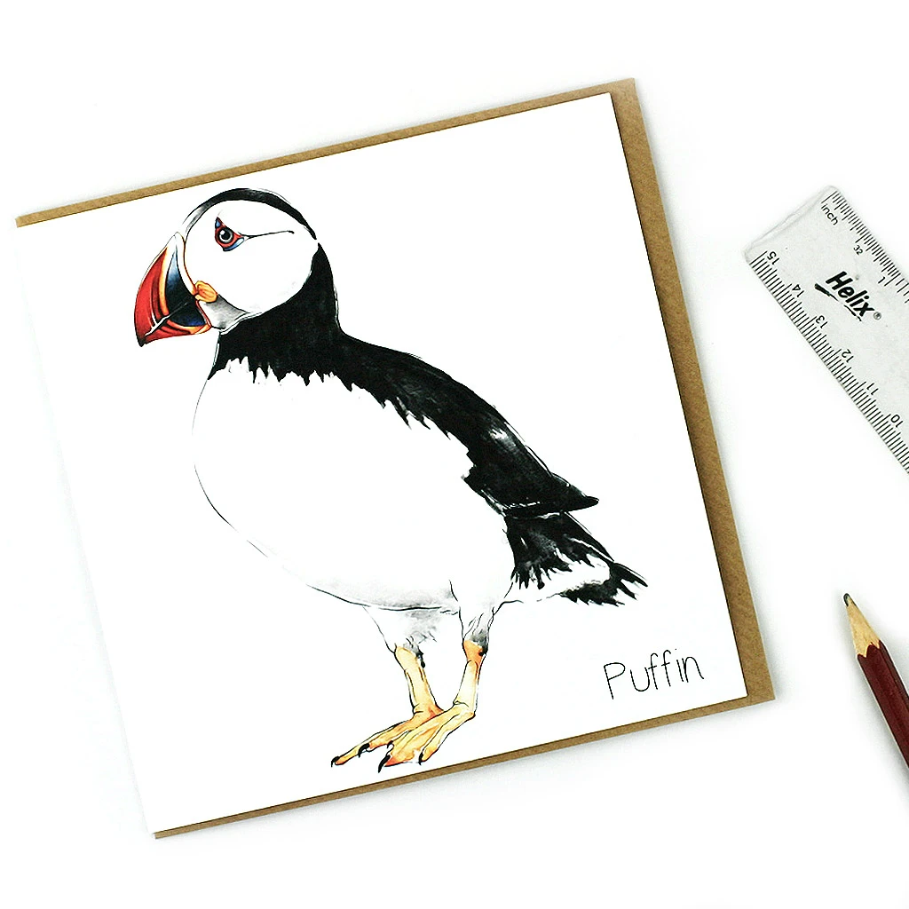 A contemporary watercolour illustration, featuring a puffin