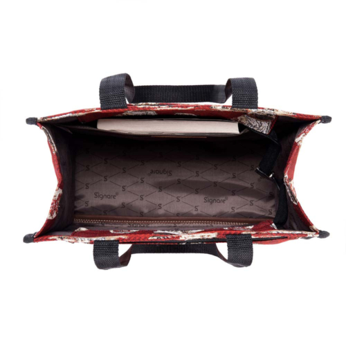 Top of the bag is gusseted with the tapestry material and has zip fastening across the full width